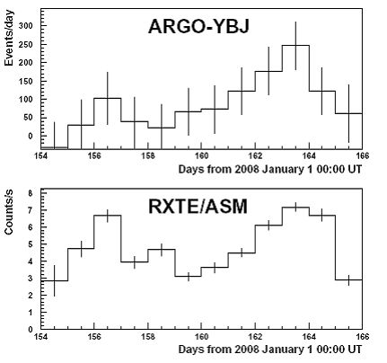 下面的两图分别显示了Mrk421在2008年爆发时ARGO-YBJ在甚高能(~TeV)和美国的RXTE卫星上X射线波段(1.5 - 12 KeV)的全天扫描(ASM)探测器记录到的光子流强随时间的变化,其中光子流强在TeV能段以(个/天)为单位,而在KeVi能段,则以(个/秒)为单位。横轴上的时间是从2008年元旦算起的天数。由此可以看出在相差一百万倍的两个不同能量段上观测到令人惊奇地相似的爆发过程!由此科学家们可以了解到有关产生爆发的机制等方面的信息。