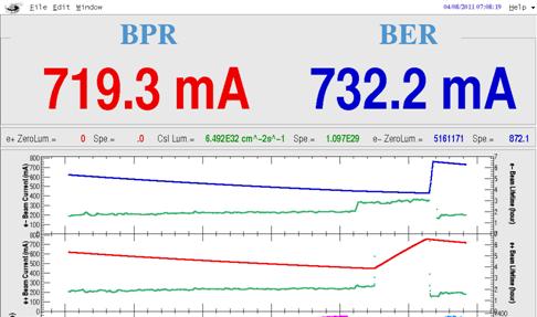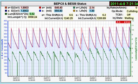 自本轮BEPCII为北京谱仪供束运行以来,对撞亮度和积分亮度在所有运行维护人员的努力下,屡创新高。本周加速器运行人员在上周机器研究的基础上,再接再厉,提高注入效率,提高对撞流强,并进一步优化了对撞参数,4月8日凌晨对撞亮度突破6×1032cm-2s-1,最高达到6.492×1032cm-2s-1,并且该夜班每次注入最高对撞亮度均稳定在6×1032cm-2s-1!此外,由于加速器各硬件系统稳定运行,北京谱仪取数也工作正常,积分亮度也创造了14.95pb-1的班最新纪录和29.35pb-1的日最高纪录,运行效率达到了一个新的高度!与此同时,BEPCII还稳定地提供兼用光,同步辐射多条光束线上均有用户在做实验,显示了机器的良好性能。