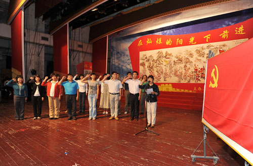会上,党办主任李广谦宣读了《关于2009-2010年优秀共产党员评选结果的通知》。王焕玉和潘卫民为获奖同志颁发奖状,进行了隆重表彰。在党办谢永红同志的带领下,15名新加入党组织的共产党员面对党旗,紧握右手,举行了庄严的宣誓仪式。