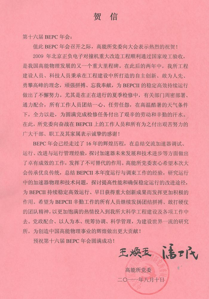 高能所党委信贺第十六届BEPC年会召开