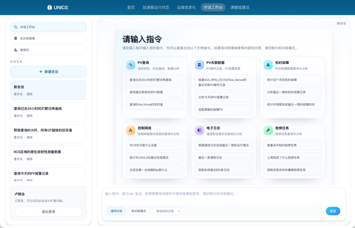 UNICS以“自然交互与智能决策”为核心理念,通过智能体技术构建高效、直观的人机交互方式,为下一代智能控制系统提供关键技术支撑。目前平台统一接入CSNS加速器实时运行数据、历史数据、剂量信息、故障记录、检修任务、控制网络状态、电子日志等多源信息,并融合操作手册与规章制度等文档资源,实现结构化与非结构化数据的协同管理,支持用户通过自然语言完成信息查询与数据调用,该方式显著降低了信息获取门槛,为复杂系统运行提供更加直观、高效的交互路径。