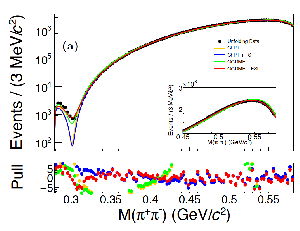 图2、π⁺π⁻质量分布与不同理论计算结果的比较。