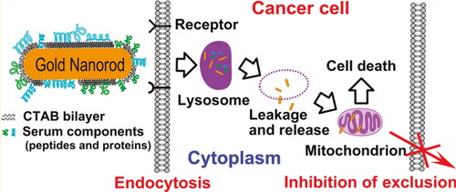 图片说明:肿瘤细胞通过内吞方式摄入金纳米棒,接着被转运到内吞体和溶酶体,进而改变了溶酶体膜的通透性而被释放到胞浆,然后靶向运输到线粒体,引起线粒体膜电位降低,最终导致肿瘤细胞的死亡。