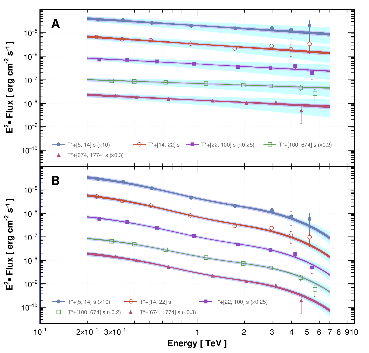图2:“拉索”测量得到的伽马射线暴221009A在5个时间段的本征谱与观测谱,能量范围约在2千亿到7万亿电子伏特之间。