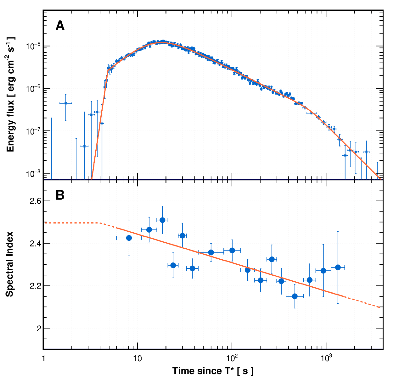 图3:“拉索”观测到的3千亿到5万亿电子伏特能量范围的GRB221009A余辉辐射的光变过程与能谱指数演化,以及函数拟合。“拉索”首次实现了伽马射线暴千亿电子伏特以上余辉辐射过程的完整观测,发现了余辉辐射过程的快速增长现象,发现了伽马射线暴GRB221009A余辉辐射过程的快速衰减现象。