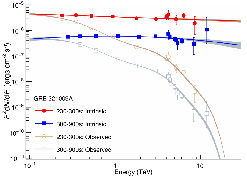 图1:拉索测量的GRB221009A在230-300秒和300-900秒两段时间的伽马射线能谱,空心点为地球上测量到的伽马射线流强,实心点为24亿光年外伽马暴发出的伽马射线流强。