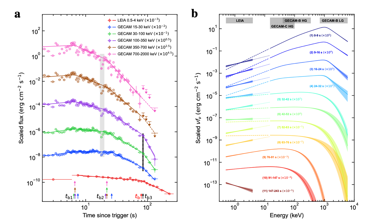 近日,来自中国科学院国家天文台、中国科学院高能物理研究所、南京大学、中国科学院紫金山天文台以及美国内华达大学等多家科研机构的研究人员组成的合作团队,通过分析天关卫星探路者LEIA和“怀柔一号”极目卫星联合获得的从X射线到伽马射线宽波段(500电子伏至6百万电子伏)数据,发现迄今第二亮伽马暴(编号为GRB 230307A)在伽马射线和X射线波段表现出截然不同的特征,X射线辐射的持续时间要显著长于伽马射线,且其X射线的能谱与根据伽马射线能谱分布向X射线波段外推的结果存在显著的差异。特别是在伽马射线辐射消失后,X射线波段显现出由磁陀星驱动的辐射成分,从而发现了磁陀星作为中心引擎的直接证据。
