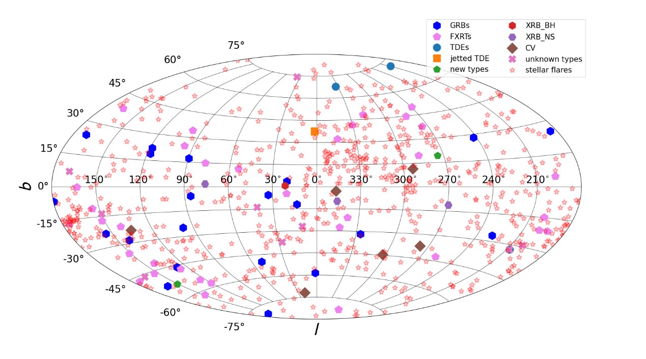 “天关”卫星所探测到的X射线暂现天体种类丰富,涵盖了恒星、白矮星、中子星、各种质量类型的黑洞、伽马射线暴、超新星等,辐射持续时间从几十秒到数月不等,跨越了6个量级。这些发现中还包括了新的爆发现象,其探测目标的多样性前所未有,极大地拓展了人类对动态宇宙的认识。