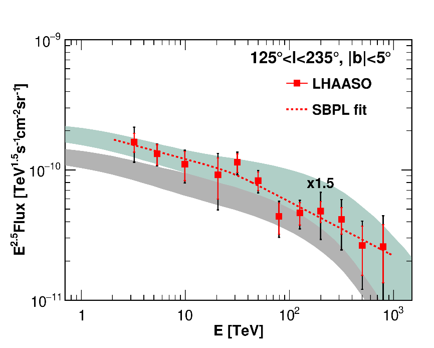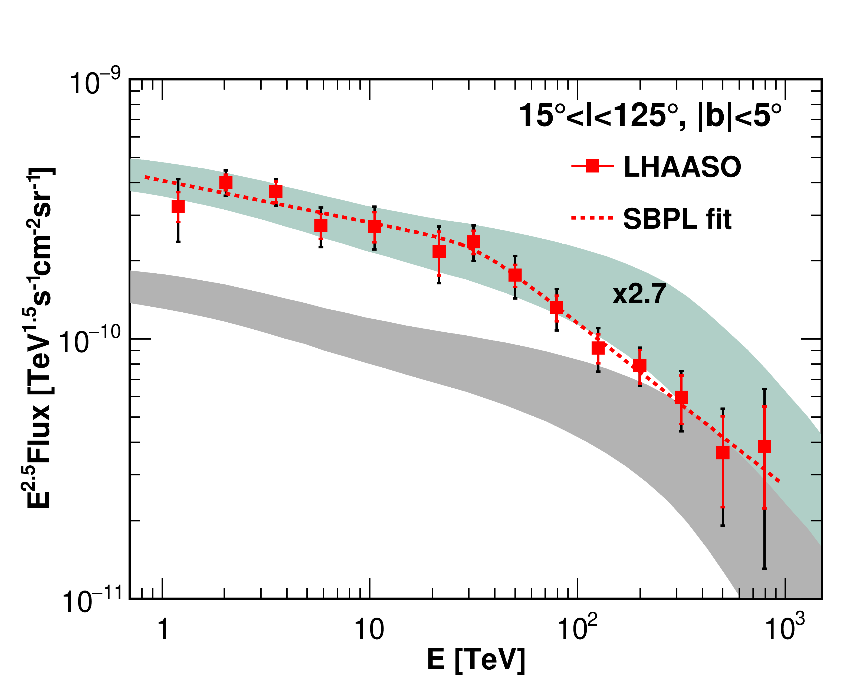 LHAASO是由中国科学院高能物理研究所牵头、国内多家研究院所和高校参与建设的国家重大科技基础设施,在甚高能和超高能伽马射线观测方面具有国际领先的水平。利用LHAASO观测数据,分析团队对银盘1-25 TeV的弥散伽马射线辐射进行了精确测量,这是目前在甚高能段对银盘弥散辐射最精确的测量,也是首次在该能段探测到外银盘面(经度125~235度)的弥散辐射。结合此前LHAASO平方公里阵列在超高能段的测量结果(https://doi.org/10.1103/PhysRevLett.131.151001)和Fermi卫星在TeV以下结果,我们首次实现了对银盘弥散辐射能量跨度达6个数量级的精确观测。与宇宙线和星际介质相互作用模型预期结果相比,LHAASO测量的流量更高(图1),能谱形状和空间分布均存在差异,意味着传统的宇宙线模型无法描述观测结果,需要做出重要修改。该观测结果为理解宇宙线起源、传播以及极端天体物理加速器提供了新的见解。