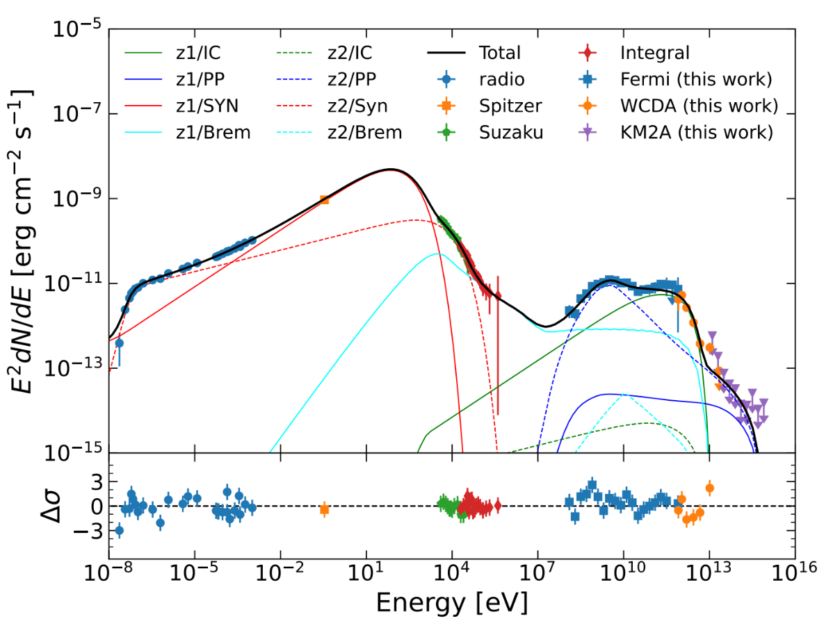 拉索团队通过对超过1100天的高质量观测数据(能量高于0.8 TeV)进行了深入分析,首次发现Cas A的伽马射线能谱在甚高能段(TeV以上)显著变软,且在1 TeV附近的流量约为传统成像大气切伦科夫望远镜(IACTs)测得值的两倍。结合费米大面积望远镜(Fermi-LAT)在0.1 GeV至1 TeV能段的观测数据,研究团队发现Cas A的伽马射线能谱在30 GeV以上与单一幂律分布存在显著偏差,呈现出明显的鼓包结构(见图1)。这个鼓包结构的发现,说明Cas A的伽马射线能谱存在精细结构,并不能用之前简单的存在高能截断的幂律谱强子模型解释。LHAASO揭示的鼓包结构,可以解释为来自前行激波加速电子的逆康普顿过程(如图2),这样虽然被加速电子的最大能量由于受辐射能损的影响只有几个TeV,但是被加速原子核的能量可以很高,甚至达到拍电子伏。预期随着观测数据的积累,Cas A在10TeV以上能段也可以被LHAASO探测到。这些结果为完善超新星遗迹伽马射线辐射能谱演化的统一模型提供了重要依据。
