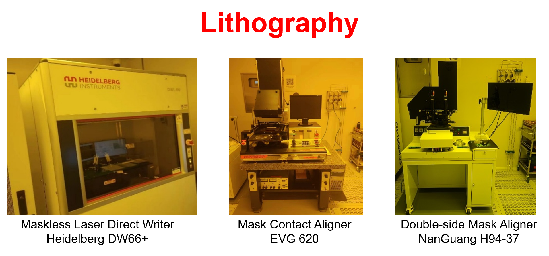 位于百级洁净间,当前包括1台无掩膜激光直写光刻机与2台双面接触式光刻机(如图1所示,另有1台激光直写与1台接触式光刻在采购中),目前支持8英寸及以下样品,极限光刻精度约0.5μm,套刻对准精度≤0.5μm。光刻配套设施位于湿法间,包括匀胶机、显影机、超声清洗机、热板等,均置于通风橱内;