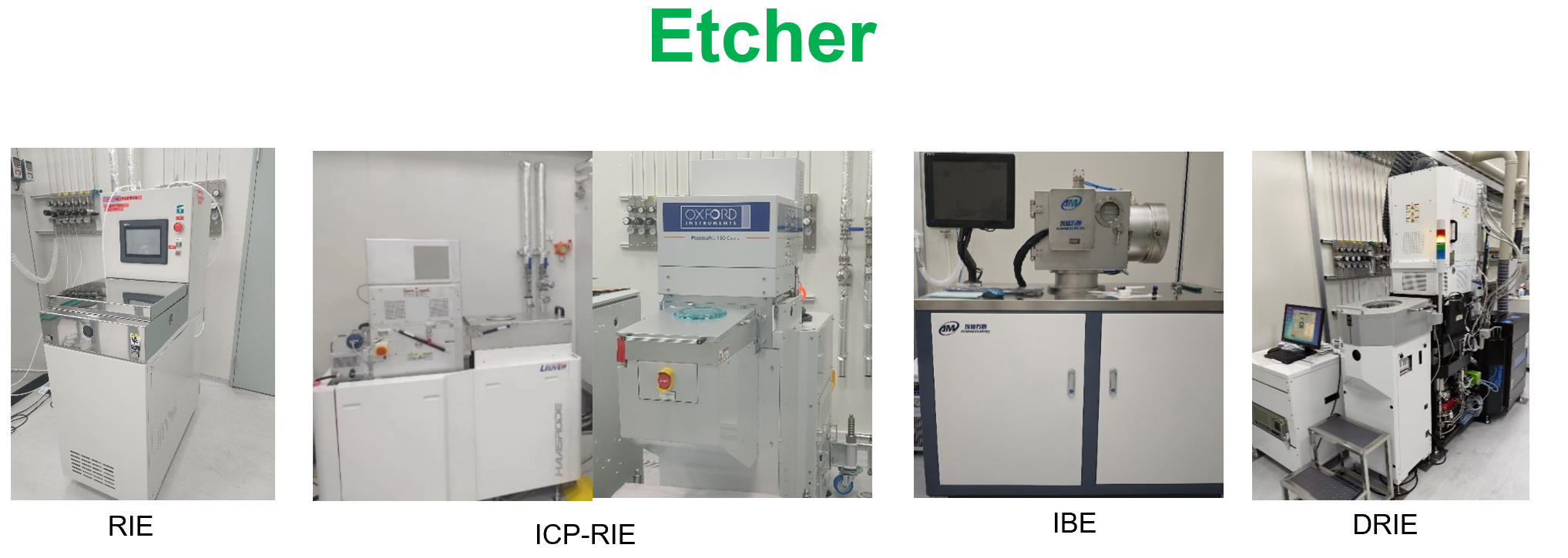 同样位于千级间和万级间,包括2台反应离子刻蚀机、2台感应耦合等离子体-反应离子刻蚀机、2台离子束刻蚀机与1台深硅刻蚀机(DRIE),用以刻蚀SiO2、SiNx、Si、Ti、Au、Nb及Nb氧化物、Al及Al氧化物等等多种材料。支持8英寸及以下尺寸的样品,薄膜刻蚀的不均匀度≤5%。多数设备具备终点检测模块,通常能够控制过刻时间≤5%;