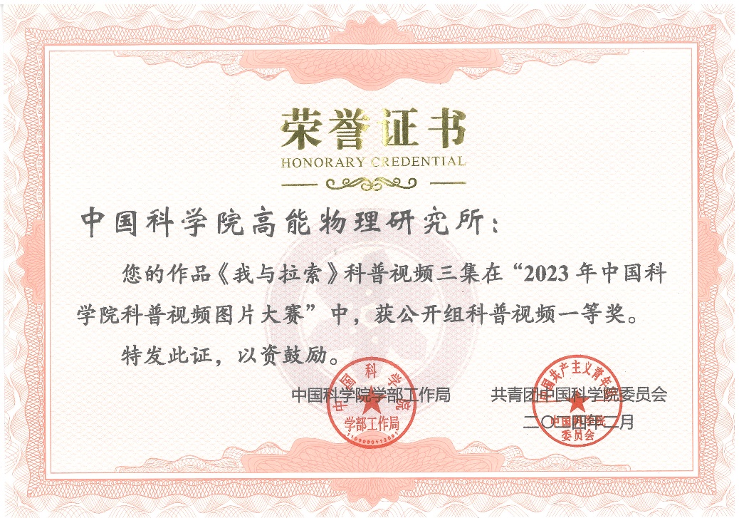 《我与拉索》获得“2023年中国科学院科普视频图片大赛”公开组科普视频一等奖