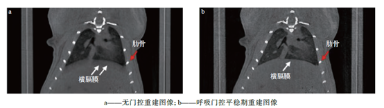 本方法可用于无外接设备的呼吸、心跳实时监测,肺部病灶体积精准测量以及肺部呼吸运动状态检测,也可用于心脏运动状态检测、冠状动脉状态检测和心血管内血液的空间状态变化检测,在实现肺部器官精准成像上具有重要意义。同时由于本方法在体积小、呼吸和心跳频率较高的小鼠中取得了很好的效果,因此对象可延伸到大鼠、兔子、灵长类动物以及人类等,实现在不同物种上的应用。但门控成像会使重建过程中出现重建角度稀疏且不均匀分布的问题,导致图像出现伪影,后续可通过深度学习的方式进行进一步的重建图像优化。