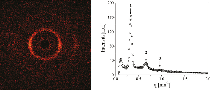 图1. TTAOH/LA混合体系在Lα相的样品的SAXS二维衍射图样(左)及散射峰分布图(右)。样品的浓度为9.13%,ρ = 0.88。