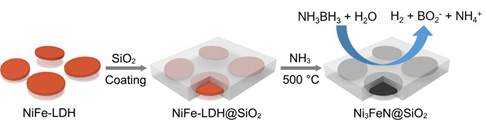 介孔二氧化硅保护的超薄Ni3FeN用于高效氨硼烷水解产氢中科院理化所张铁锐课题组通过简单的介孔二氧化硅保护法,将介孔二氧化硅包覆于前体镍铁水滑石表面,再在氨气氛围中高温煅烧即可得到介孔二氧化硅保护的超薄Ni3FeN(Ni3FeN@SiO2)。得益于介孔二氧化硅的保护作用...