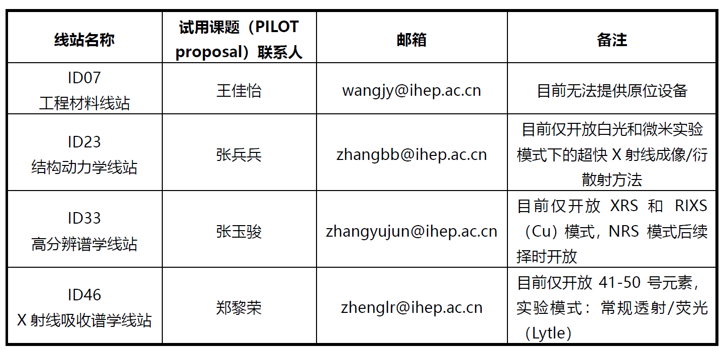 一、HEPS试用课题(Pilot Proposal)是在HEPS光束线站调试期间开展实验的课题类型。第二轮开放试用的线站有4条(HEPS一期建设共14条用户线站,已有6条线站在2025年10月份进行了第一轮试用课题征集),申请截至日期为2025年12月31日,课题有效期截止时间为2026年1月31日。第二批开放线站及联系人信息如下,各线站详细介绍请访问HEPS网页(https://heps.ihep.ac.cn/zzjs/gsxz/)。