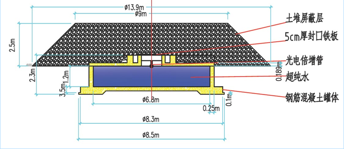MD:用于测量EAS中的缪子含量。基本构造是在一钢筋混凝土罐体内置软体水袋,水袋内装超纯水,水袋顶部中心安装一只8-10英寸的PMT,收集进入罐体的缪子在水中产生的切伦科夫光,转换为电信号进行测量。
