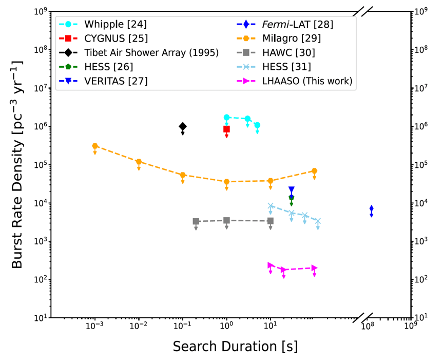 图1: 在99%的置信度下,不同实验对宇宙中每立方光年每年发生原初黑洞暴的次数给出的限制。图中洋红色上限来自于LHAASO实验组通过10s、20s、以及100s的搜寻窗口给出的国际上最严格的限制:即每立方光年每年少于5.2次。