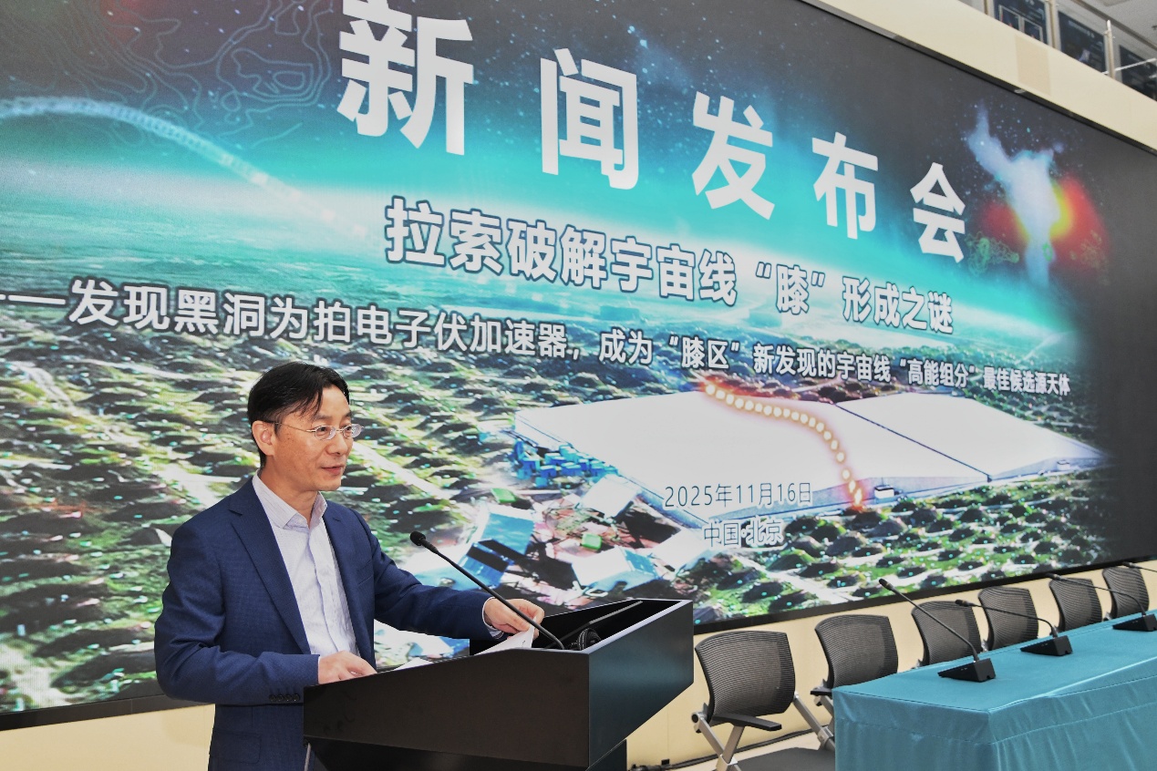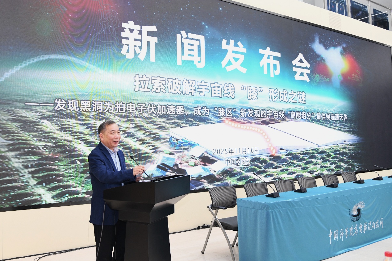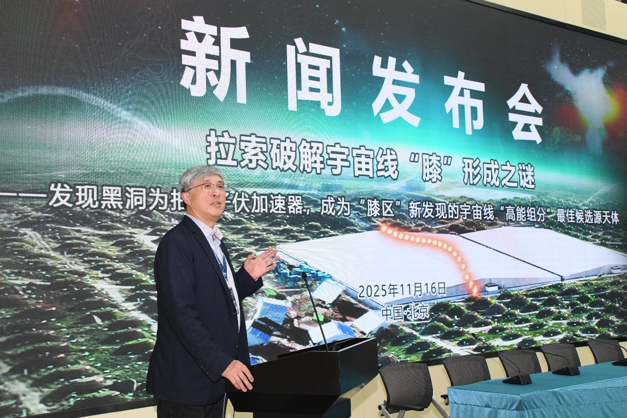 11月16日,“拉索破解宇宙线‘膝’形成之谜”成果新闻发布会在北京高能所召开,发布高海拔宇宙线观测站(LHAASO,拉索)两项具有里程碑意义的科学成果,分别发表于《National Science Review》与《Science Bulletin》,由中国科学院高能物理研究所、南京大学、中国科学技术大学、罗马第一大学等机构完成。观测发现:1)黑洞吸积驱动的微类星体是银河系中强大的粒子加速器,能够将质子加速至拍电子伏(PeV)能段;2)宇宙线质子能谱“膝区”显现超出预期的高能组分,黑洞正是其最可能的候选源天体。这一发现不仅揭示了宇宙线起源的关键机制,也为理解黑洞系统的极端物理过程开辟了一条新途径。