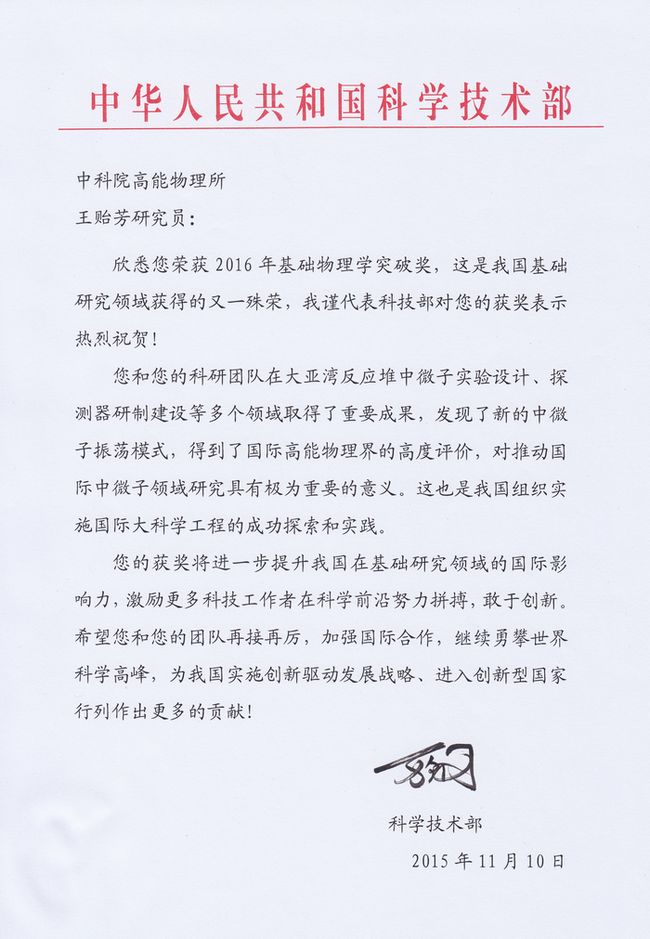 科技部部长万钢信贺王贻芳和大亚湾中微子实验团队获2016年基础物理学突破奖