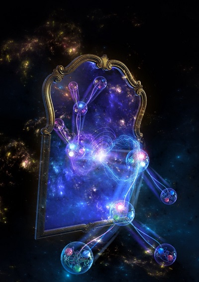 图二:正反科西超子级联衰变演示图:如果物质和反物质遵循相同的物理法则,科西超子与反科西超子的衰变应该是镜像对称的,只是空间坐标是相反的。镜像之间纽带连接表示正反超子的量子关联。