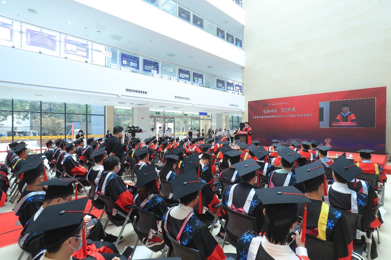 典礼上,王贻芳为院长奖获得者代表和优秀毕业生代表颁发荣誉证书,常哲为2022届校友联络人颁发聘书。随后,王贻芳为毕业生们颁发毕业证书,扶正流苏。魏龙希望毕业生们在“两个一百年”奋斗目标的历史交汇点上,要牢记党的教诲,立志民族复兴,不负韶华,不负时代,不负人民,在青春的赛道上奋力奔跑,争取跑出当代青年的最好成绩。