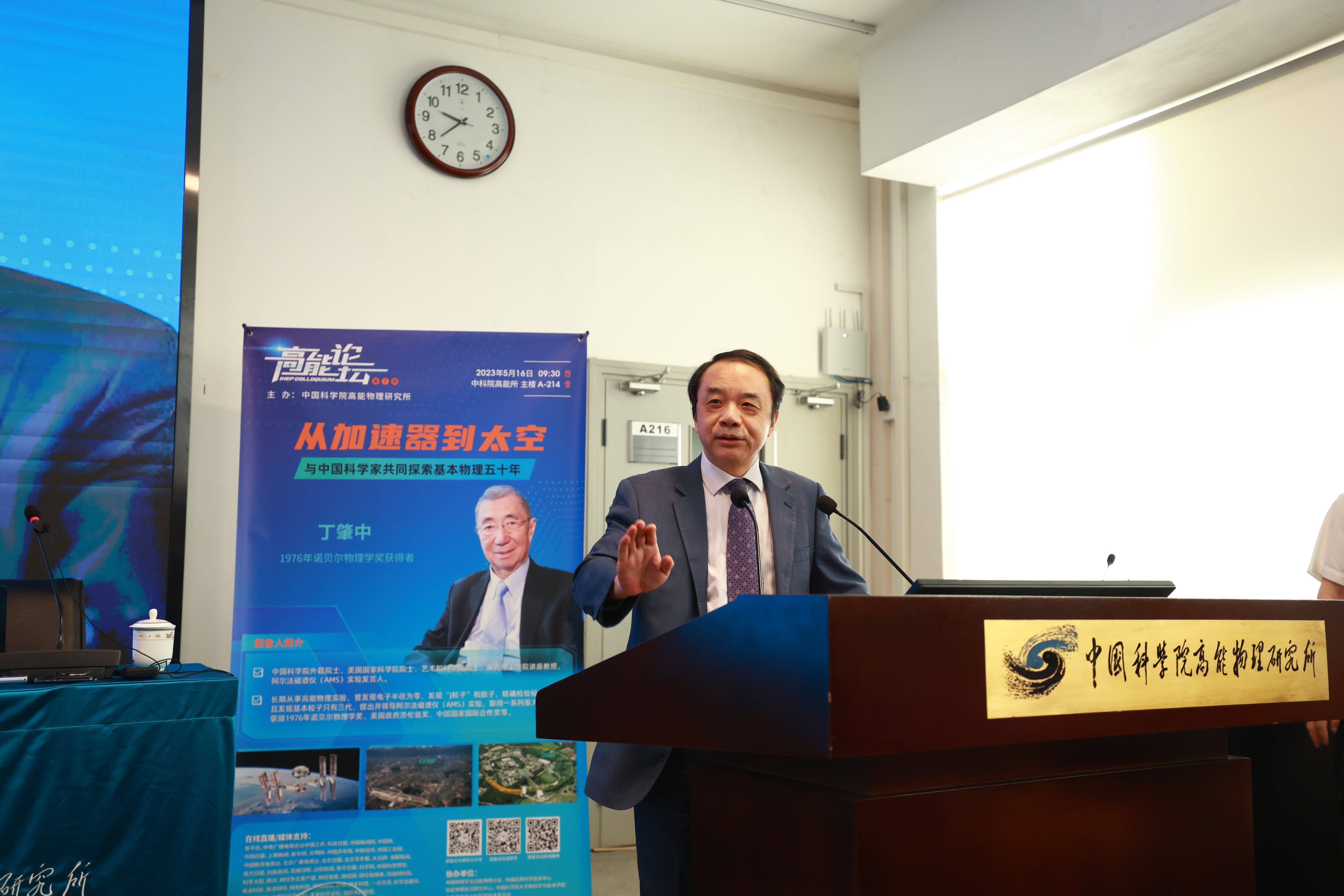 在中科院高能所成立50周年之际,5月16日,诺贝尔物理学奖获得者、中国科学院外籍院士丁肇中应邀到高能所高能论坛作题为“从加速器到太空:与中国科学家共同探索基本物理五十年”的报告。高能所所长王贻芳院士主持论坛,现场300余名科研人员、青年学生参加活动,论坛同步线上直播,全网观众达1005万人次。