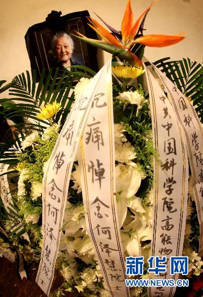 6月22日,中科院高能物理研究所代表在何泽慧家中灵堂敬献花篮。我国著名物理学家,中科院高能物理研究所原副所长、中科院资深院士何泽慧,因病于6月20日在北京逝世,享年97岁。何泽慧是我国著名科学家钱三强的夫人。新华社记者汪永基摄