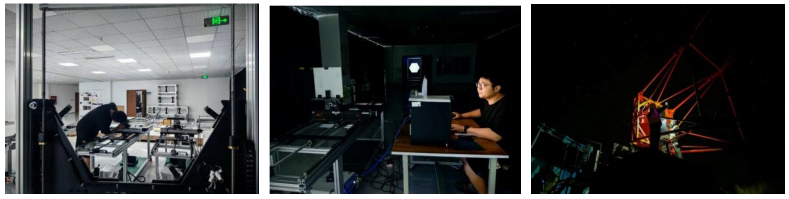 左一、二:为第二台望远镜建设进行的反射镜实验室光学性能测试 右:首台望远镜现场机械系统维护与调试